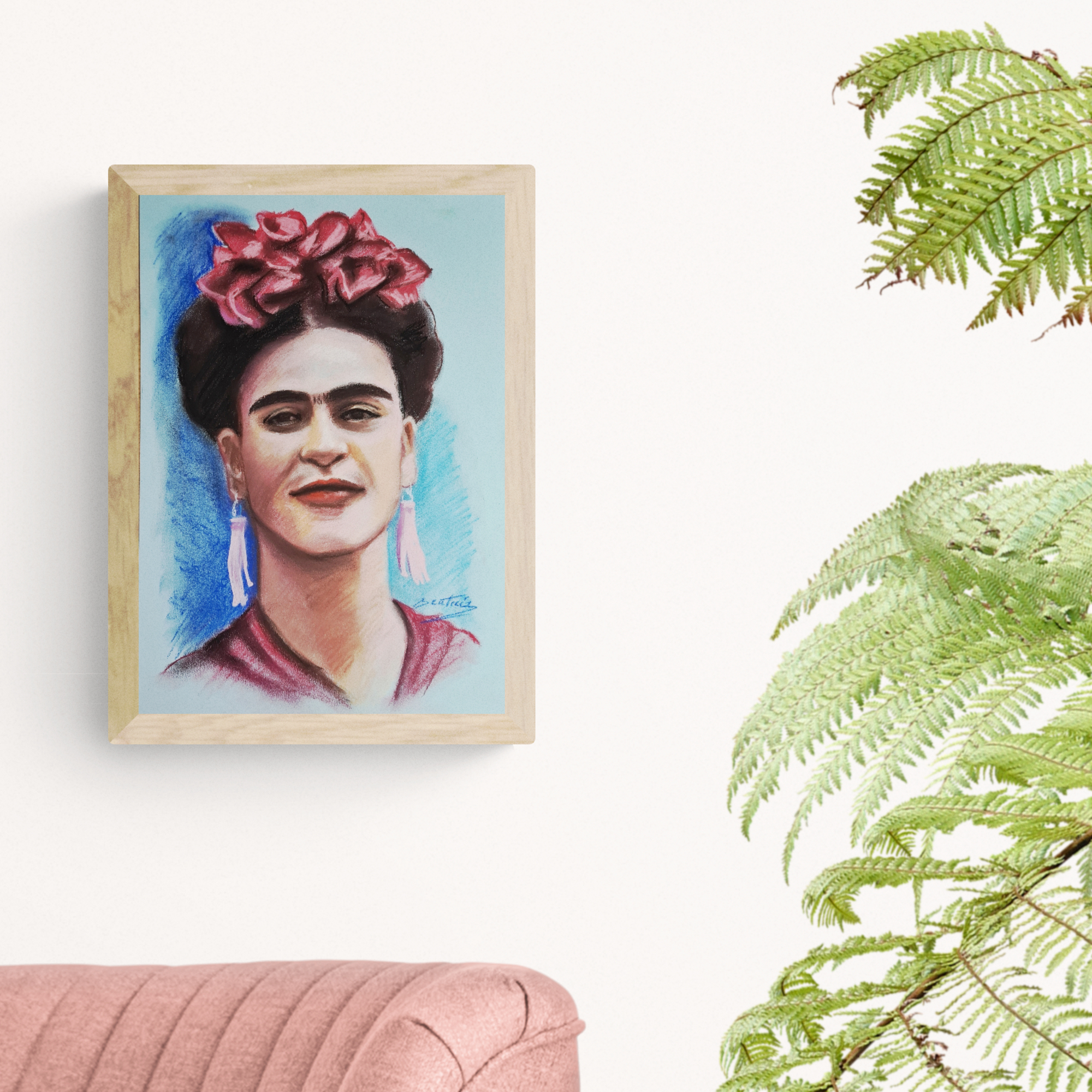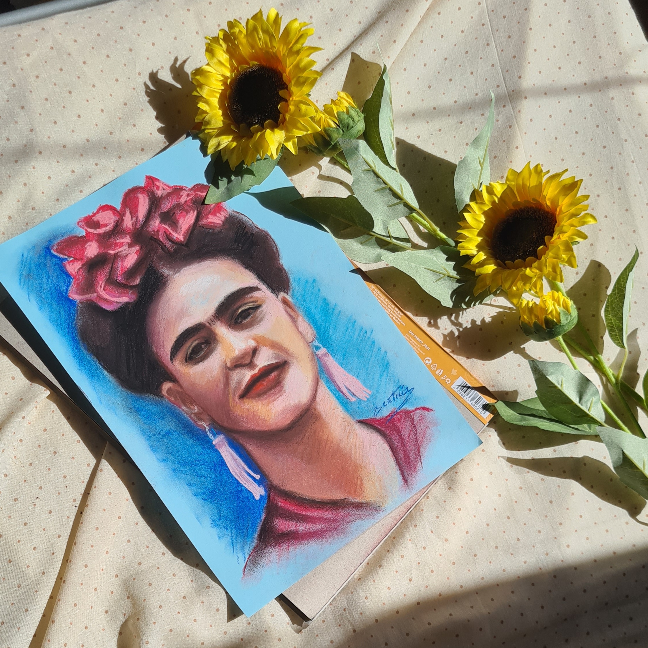Retrato a pastel de Frida Kahlo sobre cartulina azul cielo de 139g.